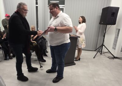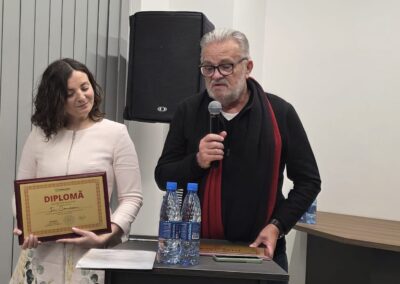 Directorul Ion Ciobanu prezintă Diploma de Recunoștință, în semn de înaltă apreciere pentru contribuția adusă domeniului artei cinematografice românești, decernată maestrului Ion Cărmăzan, cu această ocazie.